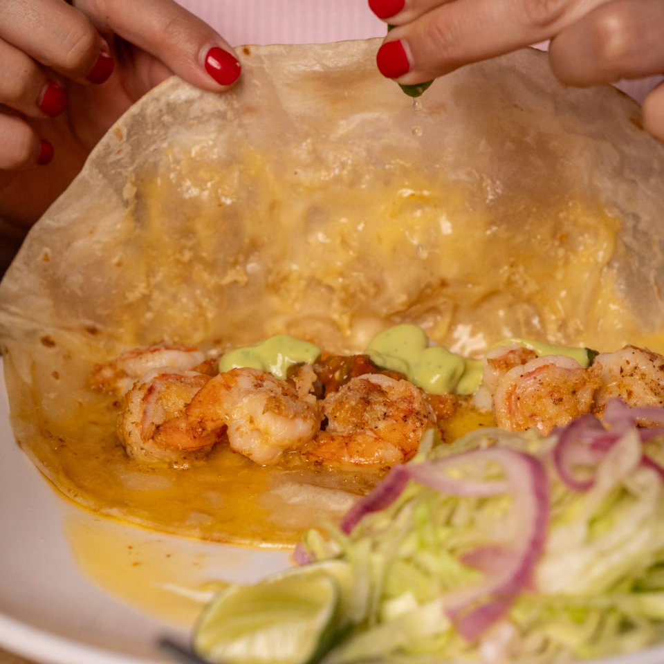 tortilla de maiz con camaron mojo de ajo, acompañado de guacamole salsa y verduras