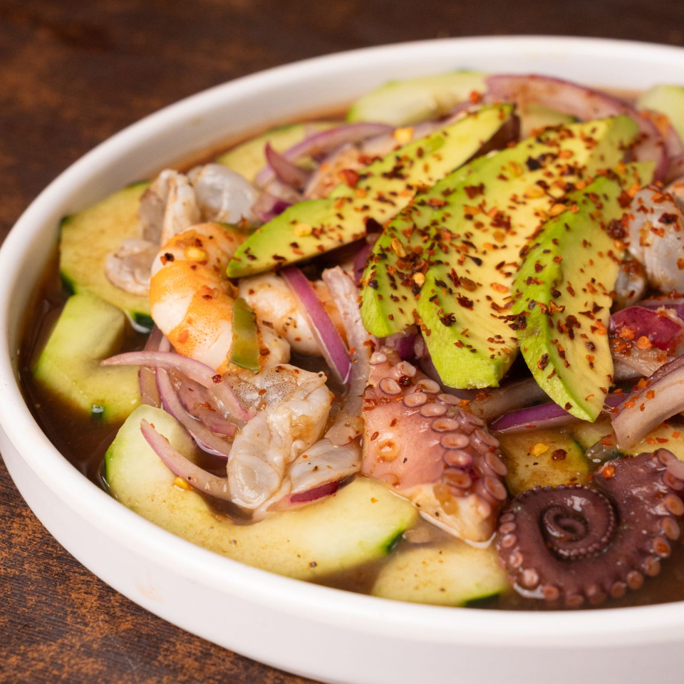 CAMARON COCIDO Y PULPO CON UN TOQUE PICOSITO DE SALSA DE AGUACHILE CORONADO CON AGUACATE