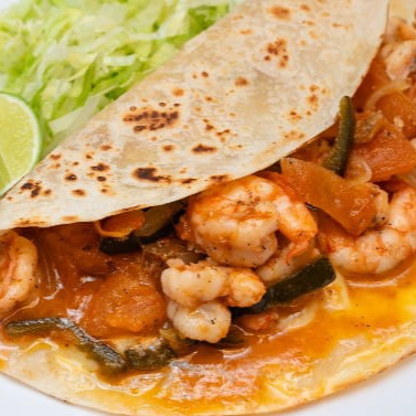 QUESADILLA DE HARINA CON CAMARON GUISADO CON MANTEQUILLA EN UNA SALSA DE CHILE DE ARBOL,ACOMPAÑADO DE GUACAMOLE.SALSA Y VERDURAS