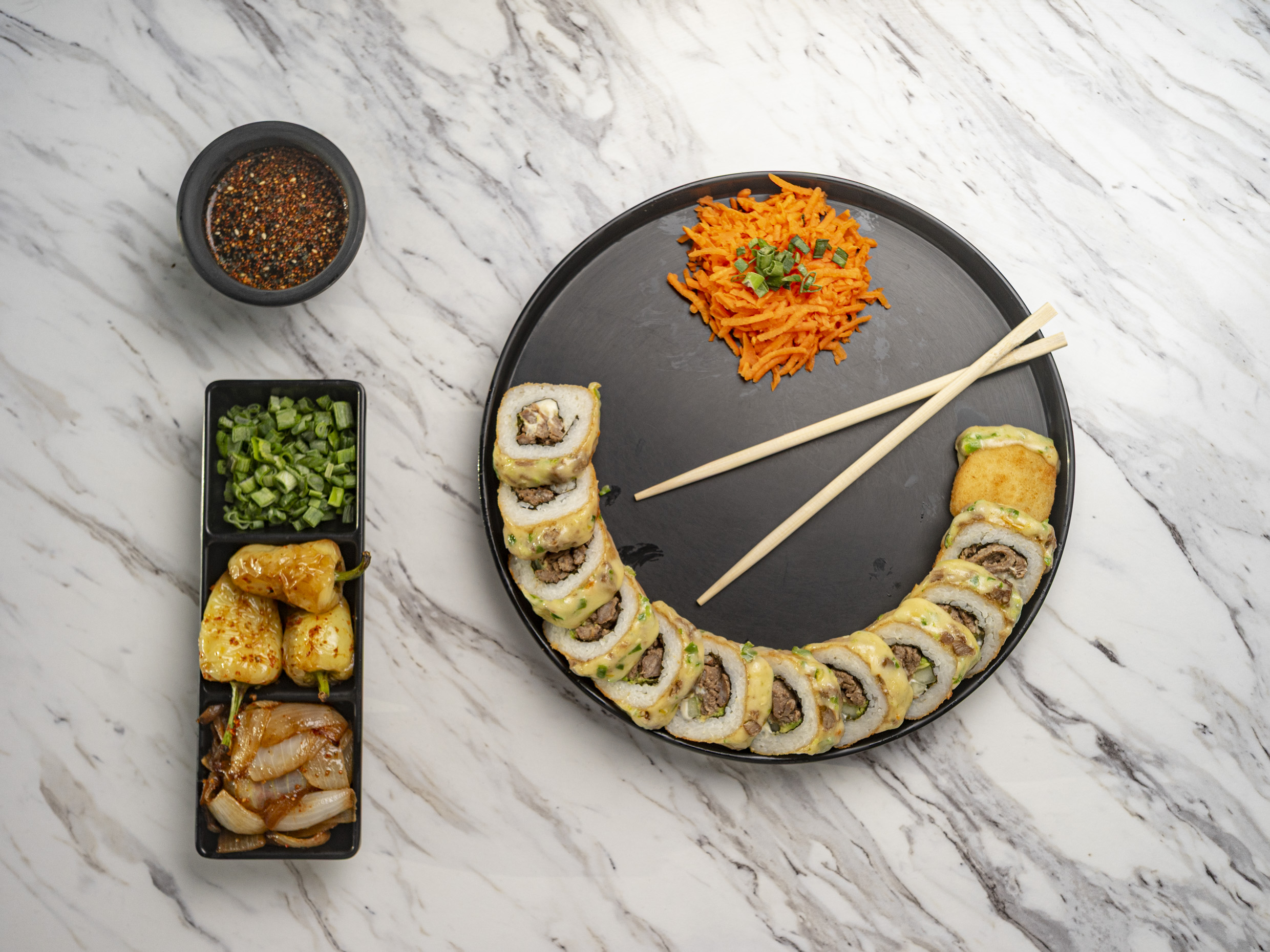 Relleno De Phila, Pepino, Aguacate, A Elegir (Res, Pollo O Camarón) Chester Spicy Tocino, Anguila, Cebollín y ajonjoli.