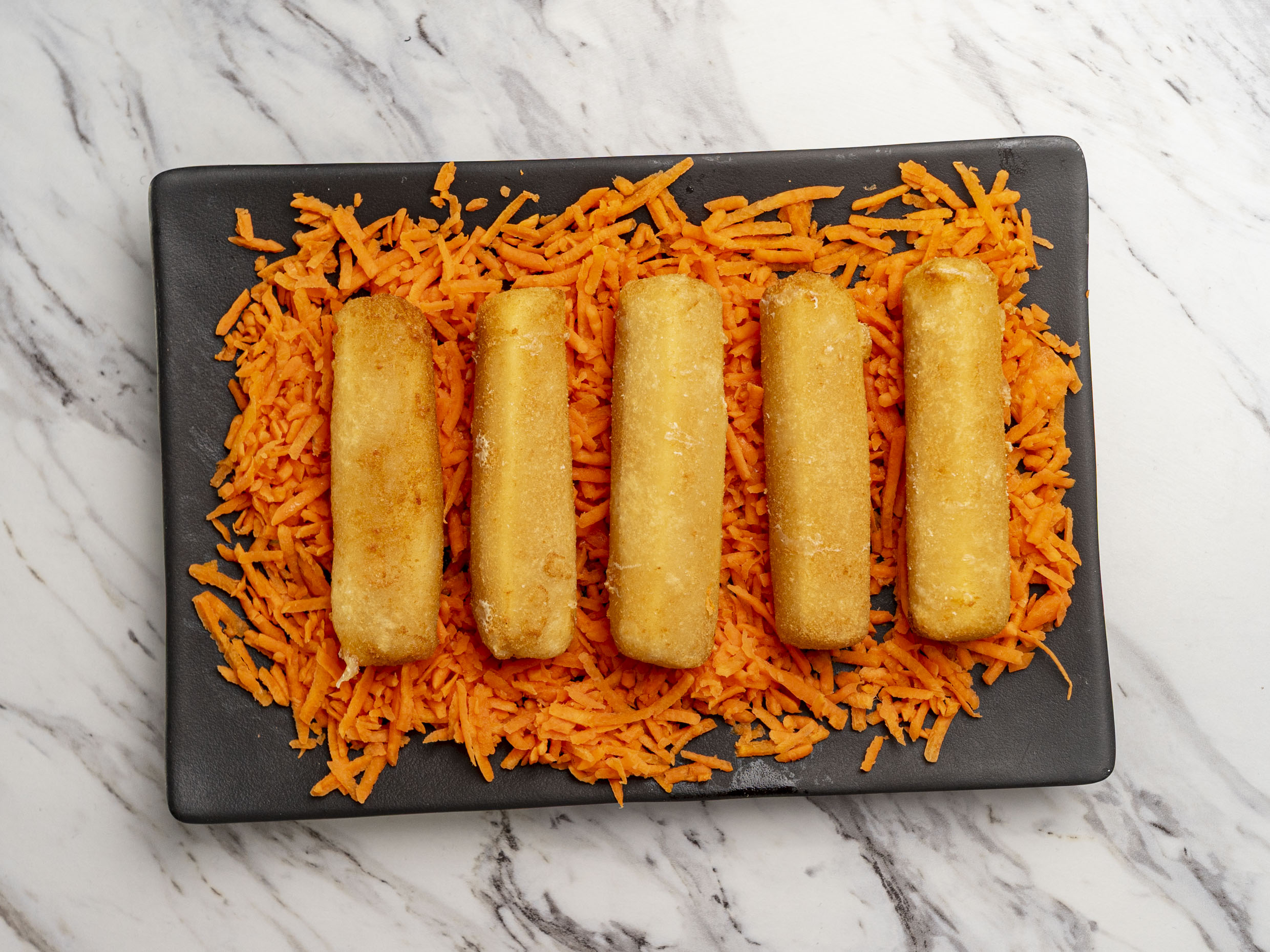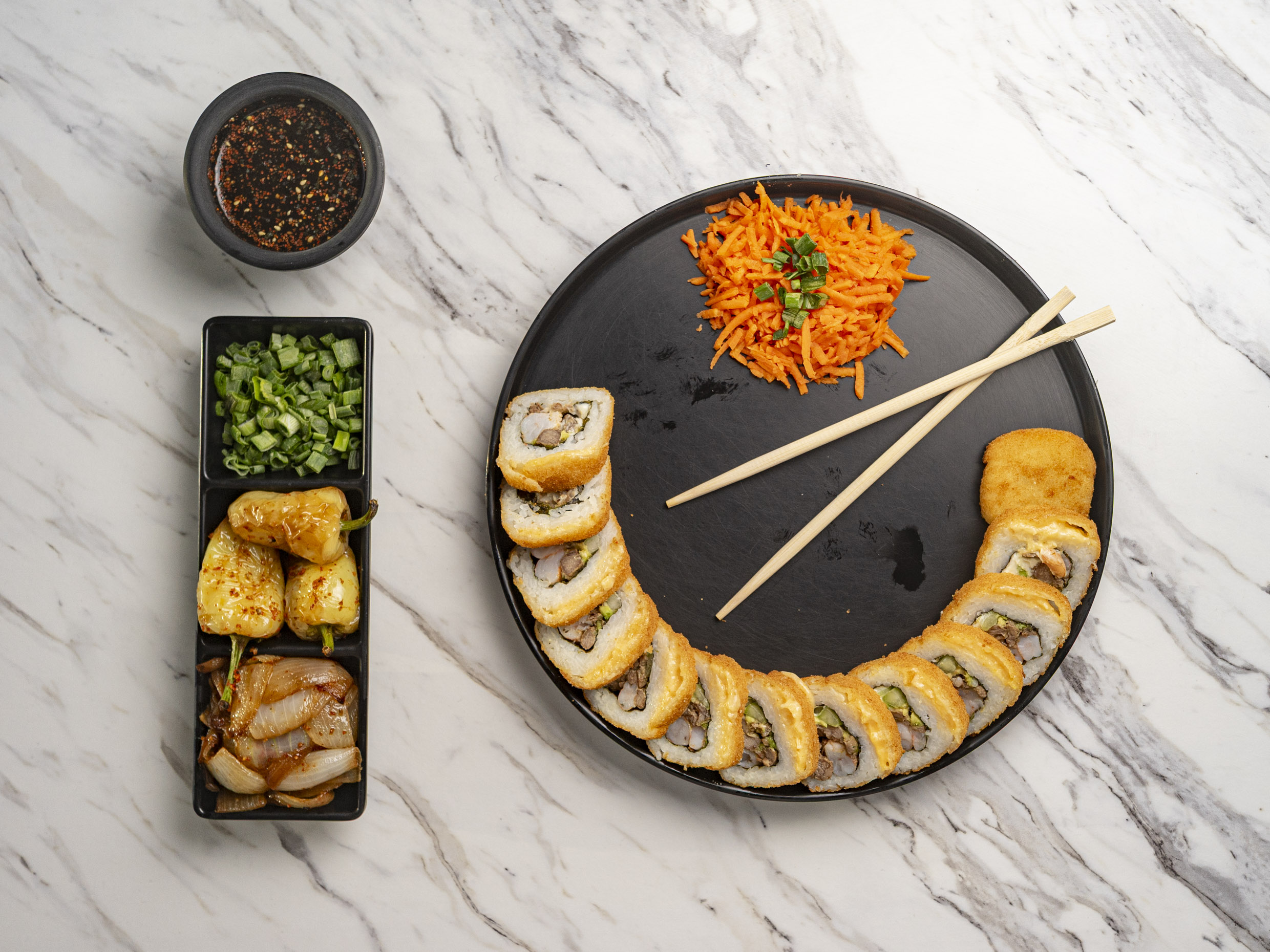 8 Camarones Empanizados, Rellenos De Philadelphia, Bañados En Salsa Roca, Servidos En Cama De Zanahoria, Cebollin Y Aderezo