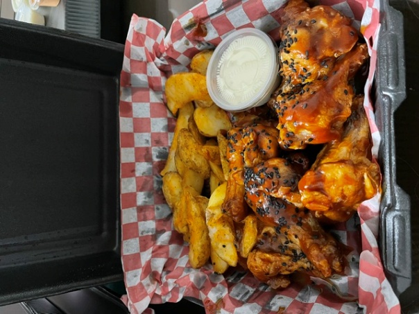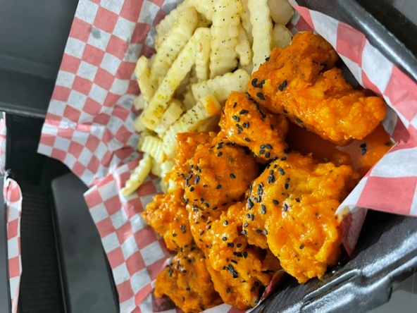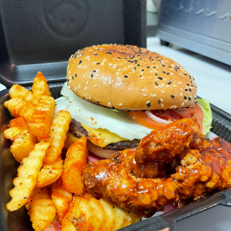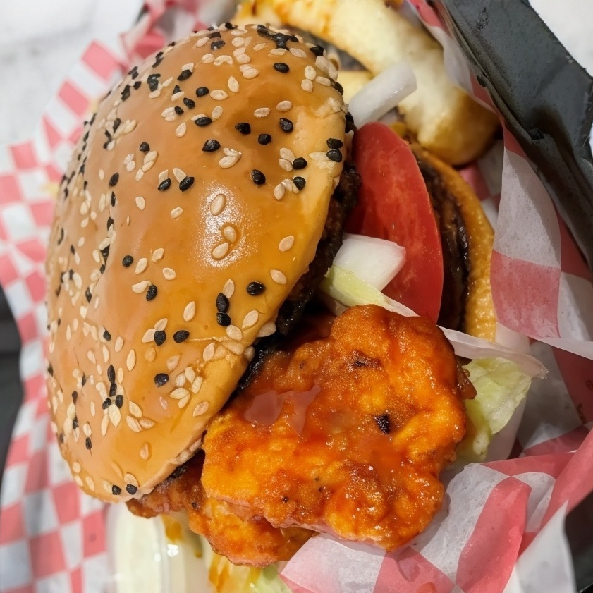 Boneless, carne de la casa, salsa a elegir, tocino, tomate, cebolla y lechuga.
