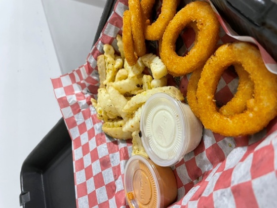 Aros de cebolla con papas a elegir, porción personal.