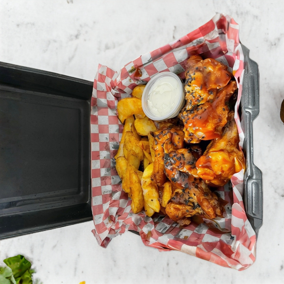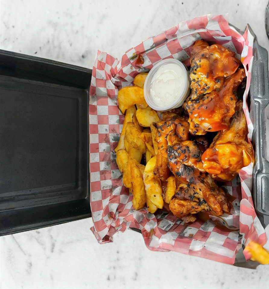 6 alitas, 6 boneless, 4 dedos de queso, 6 aros de cebolla, 120 g de papas a la francesa, 120 g de papas gajo, 2 hamburguesas o 2 hot dogs.