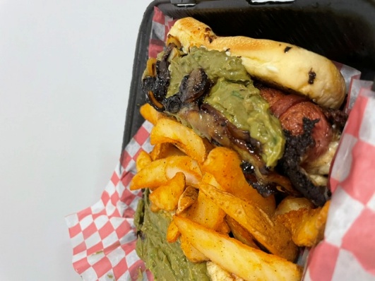Salchicha envuelta en tocino con jalapeño poppers, queso mozarella, cebolla caramelizada y guacamole.