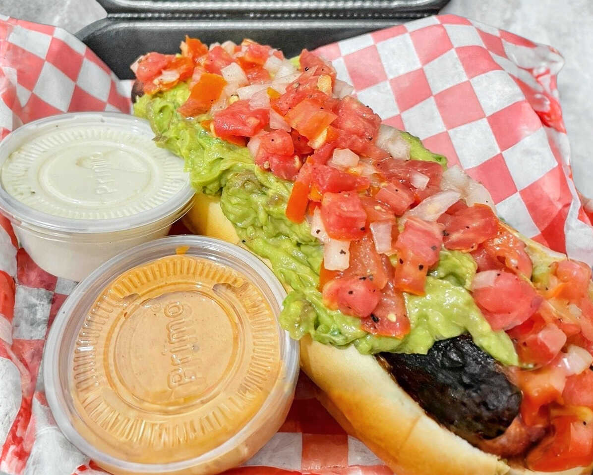 Salchicha envuelta en tocino, pico de gallo y guacamole.