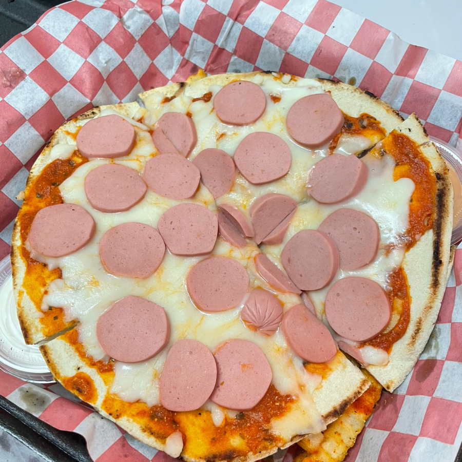 Pizza a base de pan pita con salsa de tomate, queso mozarella y salchicha. trae papas al gusto