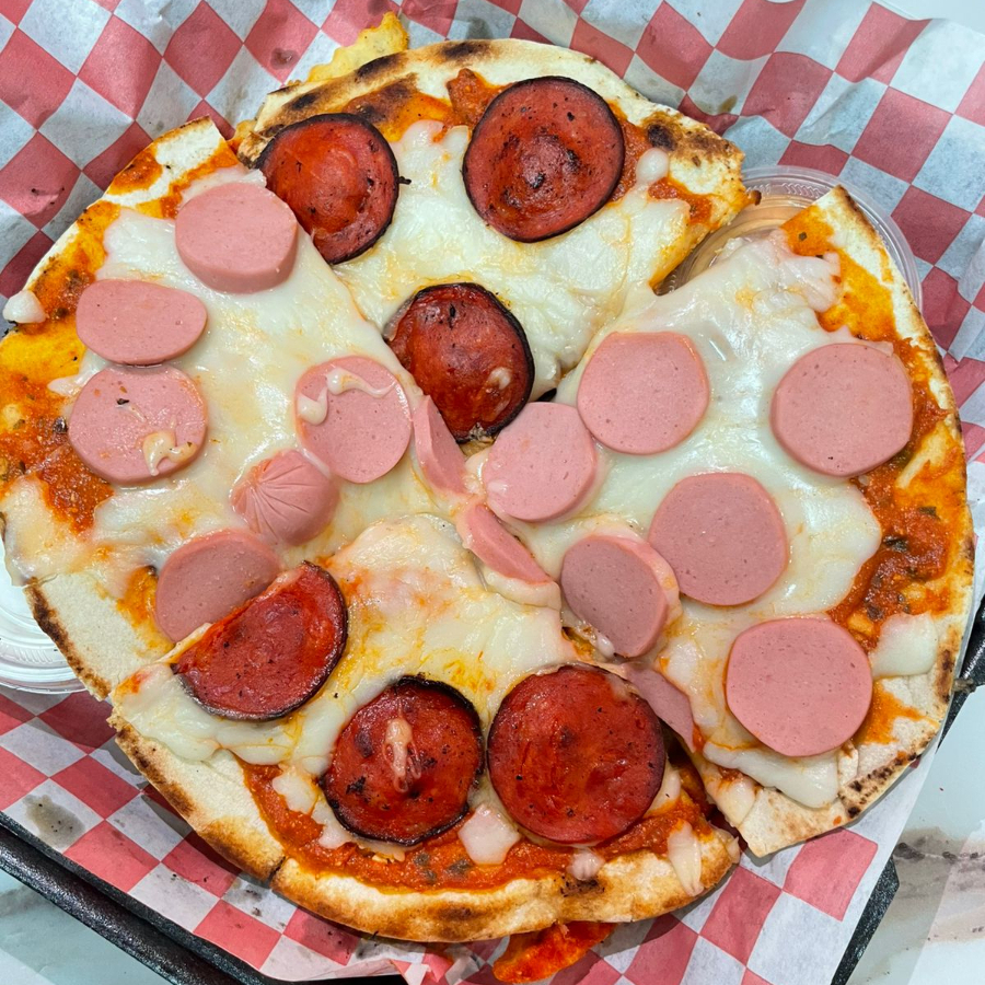 Pizza a base de pan pita con salsa de tomate, queso mozarella y mitad pepperoni y mitad salchicha. trae papas al gusto