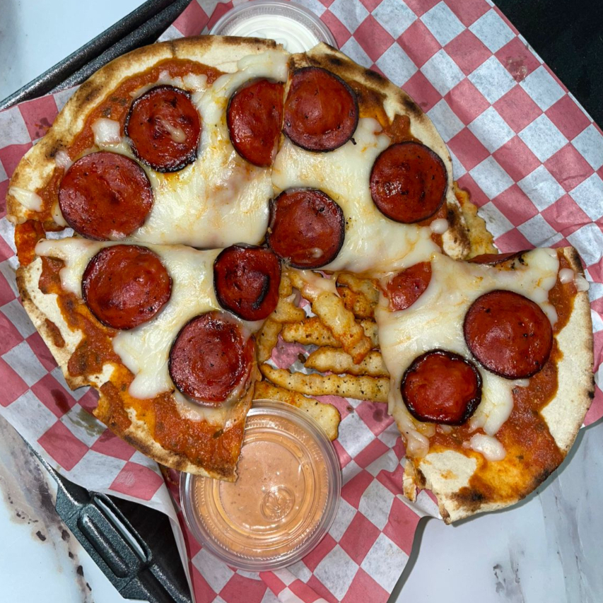 Pizza a base de pan pita con salsa de tomate, queso mozarella y pepperonis. trae papas al gusto