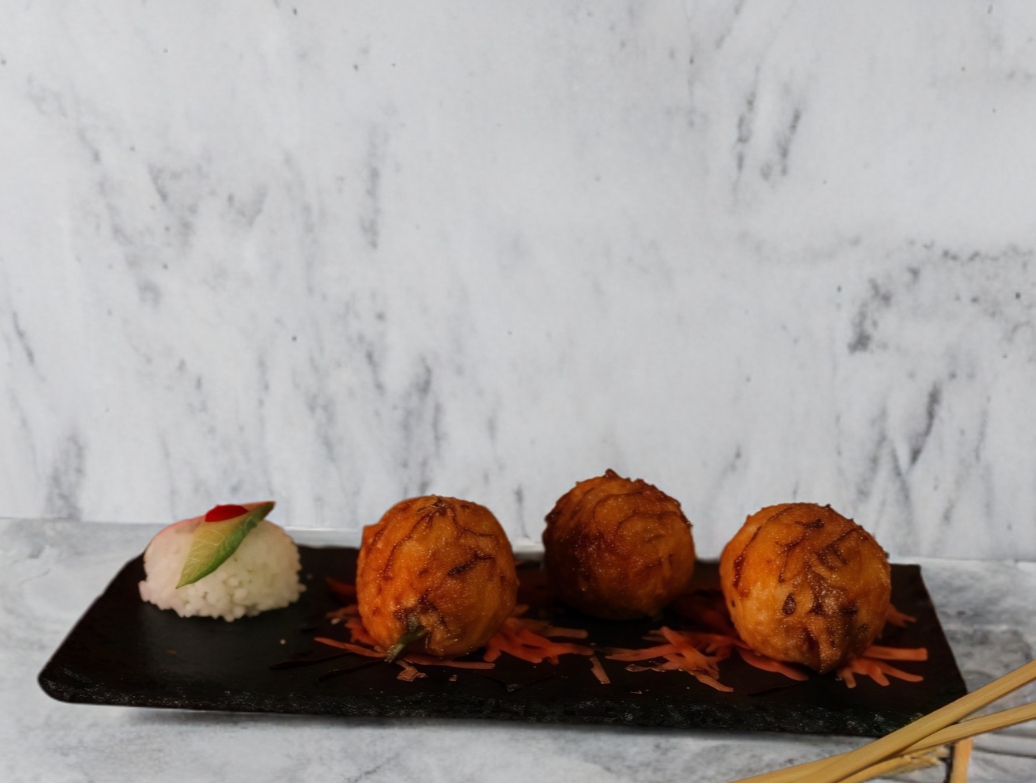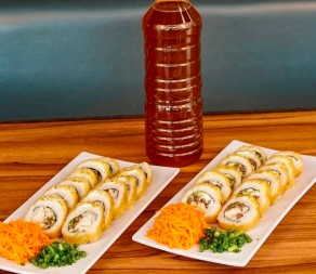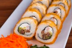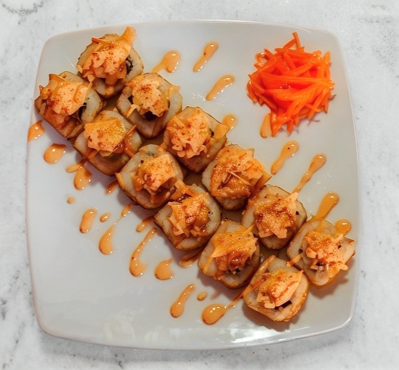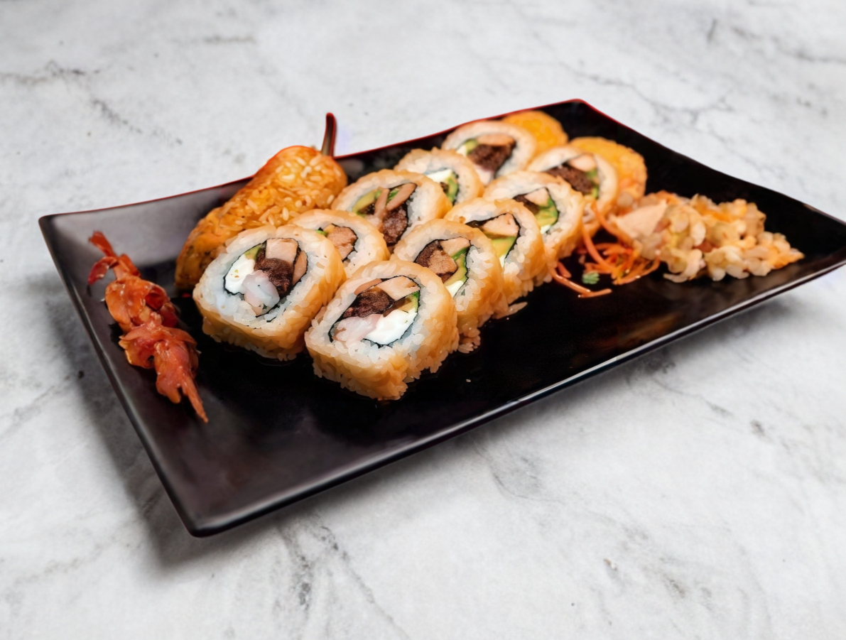 Rollo empanizado, relleno con Philadelphia, aguacate, pepino, proteínas de res y pollo, bañado con delicioso gratinado spicy, coroonado con tampicoby salsa de anguila.