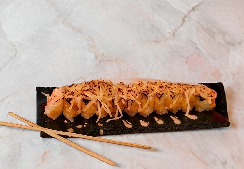 Deliciosa combinación de mezcla de arroz blanco, Philadelphia, proteínas res y pollo, tampico queso motzarella, empanizada, bañada en gratinado spicy, coronado con tampico y aguacate, bañada en salsa de anguila y un toque de ajonjolí.