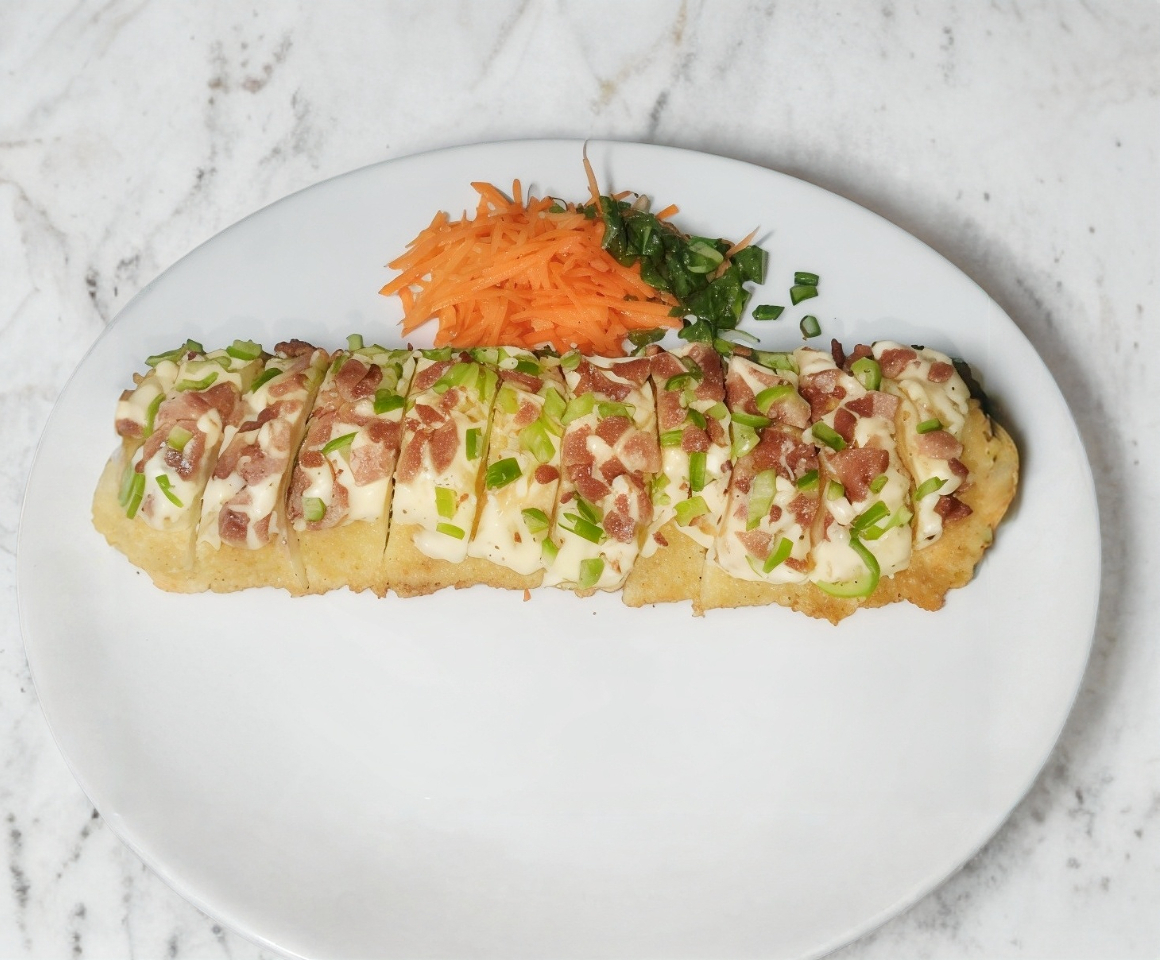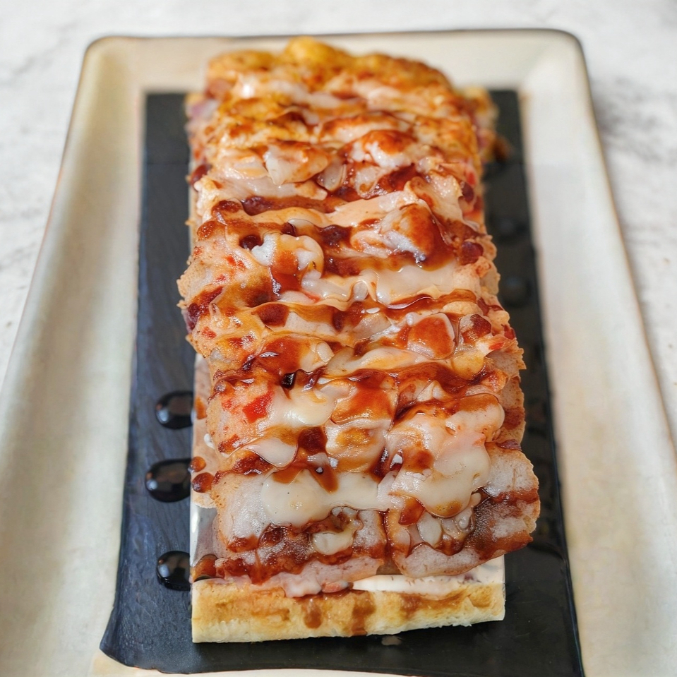 Cama de arroz empanizado con alga. Con toping de tampico res y pollo aderezo de chipotle, queso Mozarella, coronado con Philadelphia y aguacate, anguila y ajonjoli.