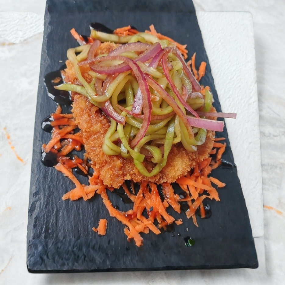 Rollo empanizado, relleno de philadelphia, aguacate y pepino, con proteína de pollo, toping de tampico, coronado con boneless ( salsa a elegir)