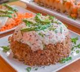 Arroz al vapor con topping de tampico, aguacate y philadelphia. Coronado con res y pollo frito