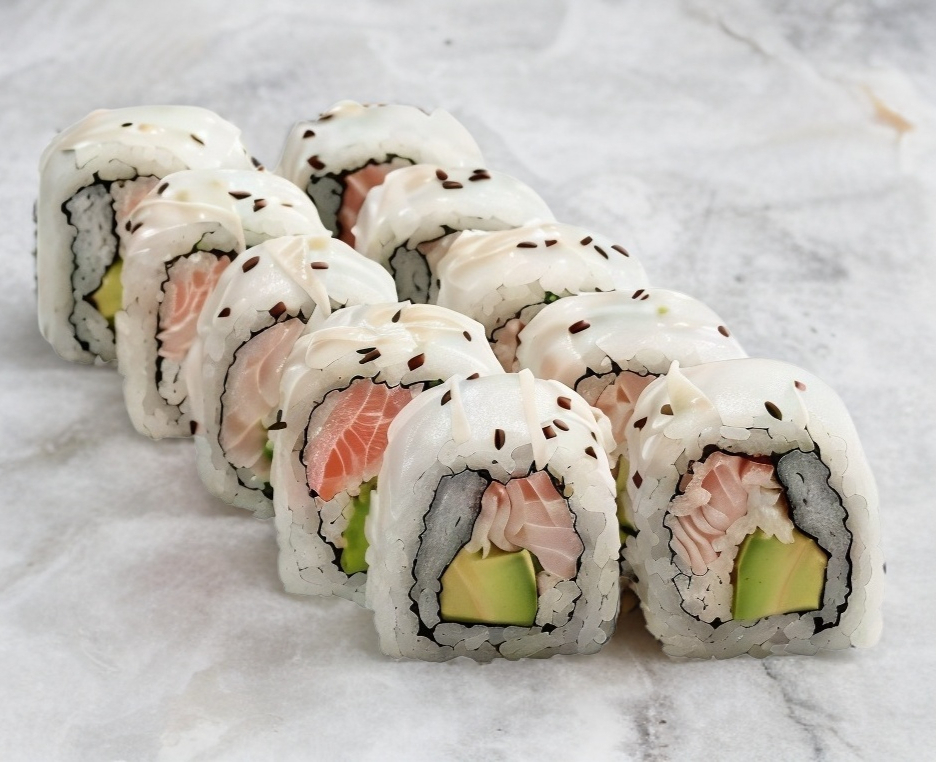 Por dentro philadelphia, aguacate, res y pollo, coronado con pasta de camarón empanizado, tocino, tampico, philadelphia, mayonesa y sriracha.