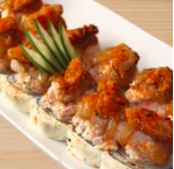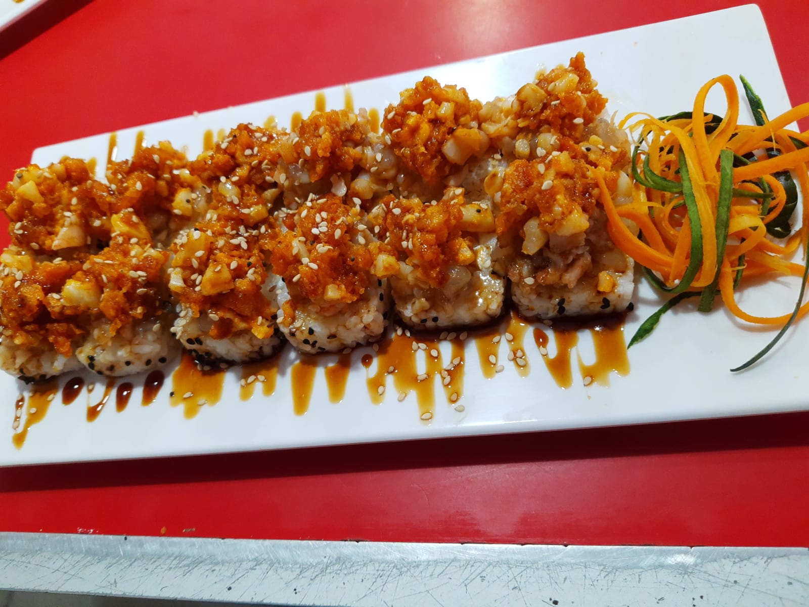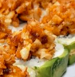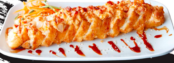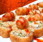 Empanizado con camarón por dentro, topping especial spicy a base de mariscos, bañado en salsa de anguila y ajonjolí. (7 piezas).