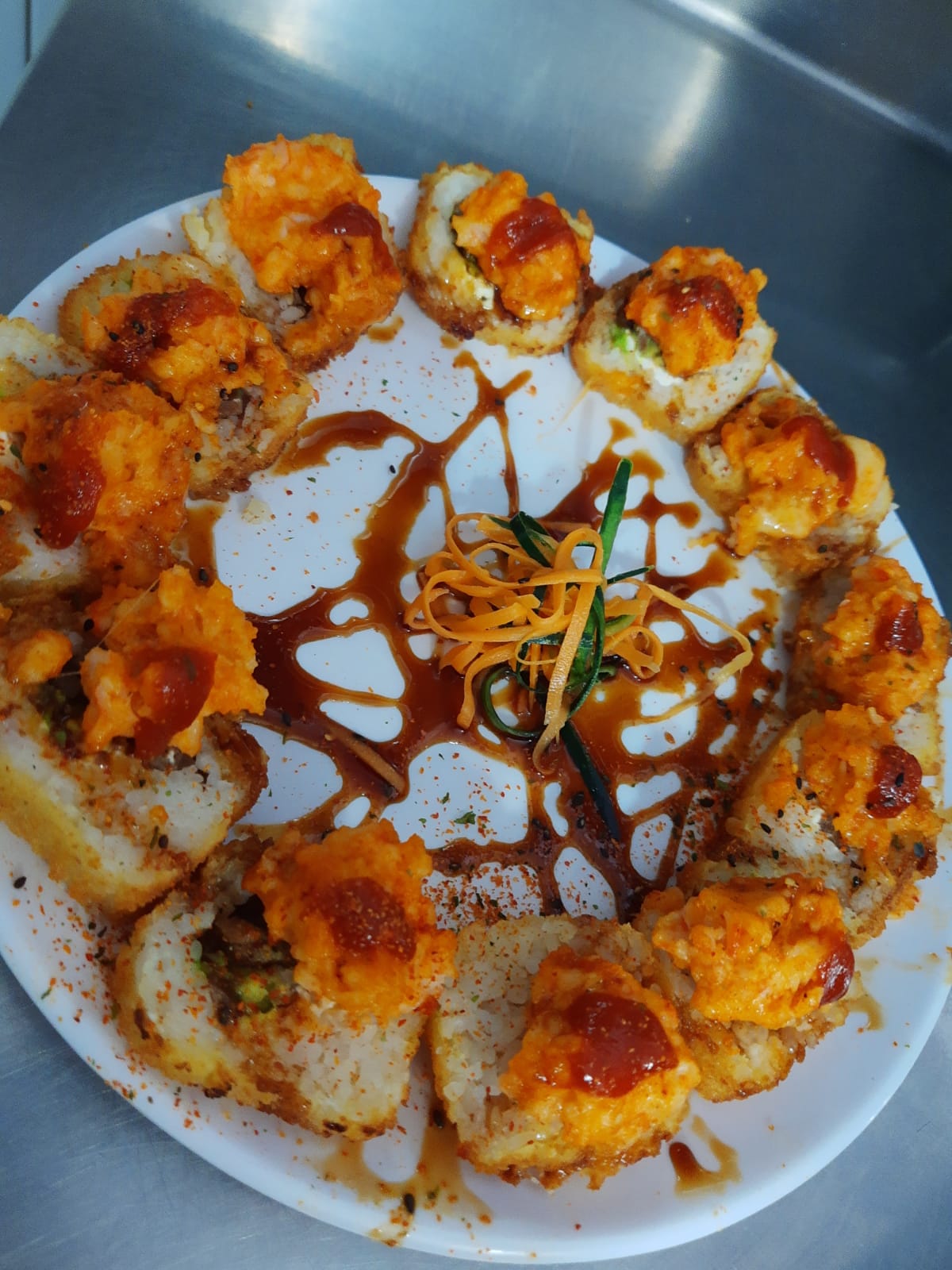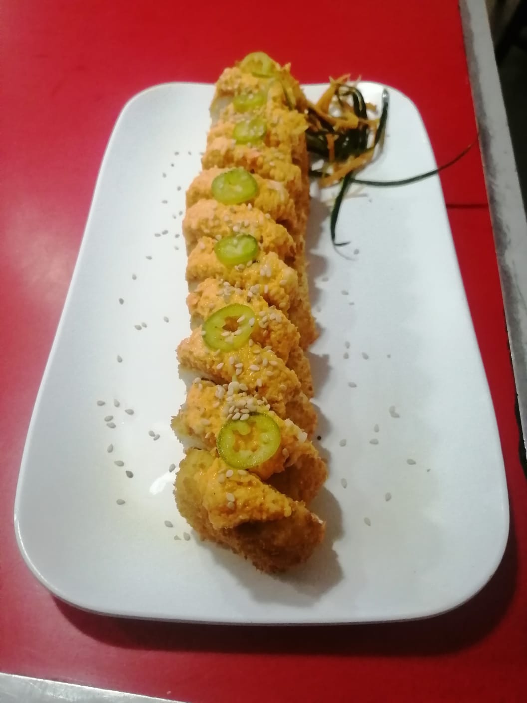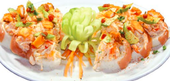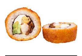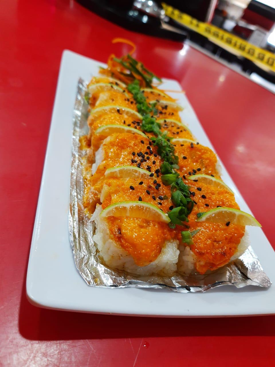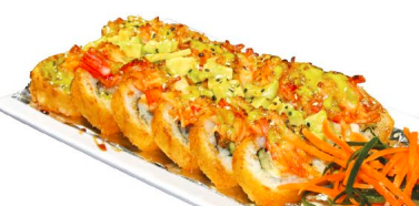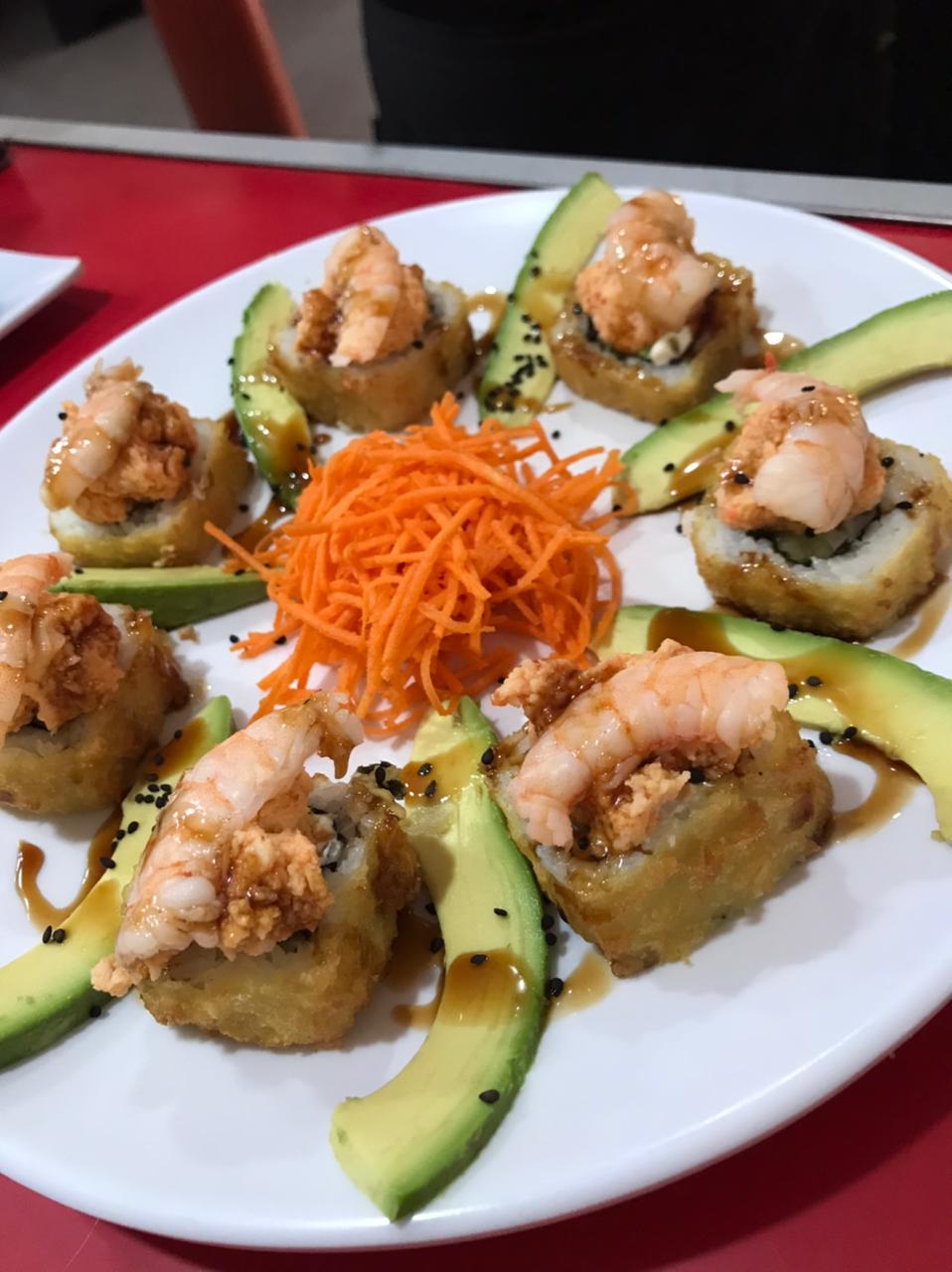 Camarones capeados dentro, lechuga, phila, aguacate y pepino. por fuera masago y ajonjolí con toping de kamikama spicy