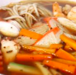 Sopa de pollo y camarón con verduras y pasta udon.