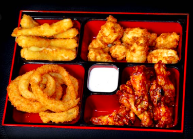 1/2 Dika esp., papas sazonadas, alitas (sabor a escoger), 1 tok chilli.