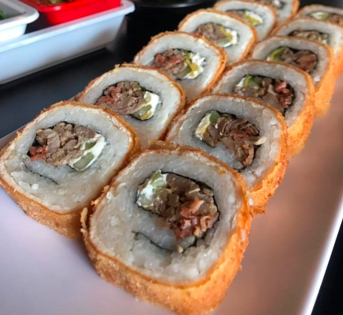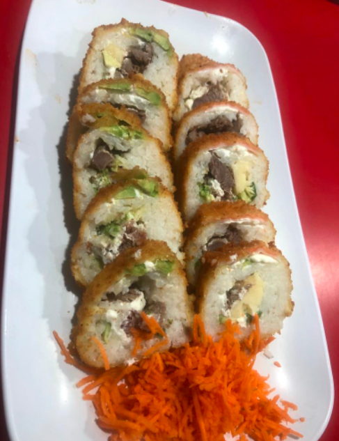 Bola de arroz empanizada de res, pollo, tocino, acompañado de tampico, Philadephia y aguacate.