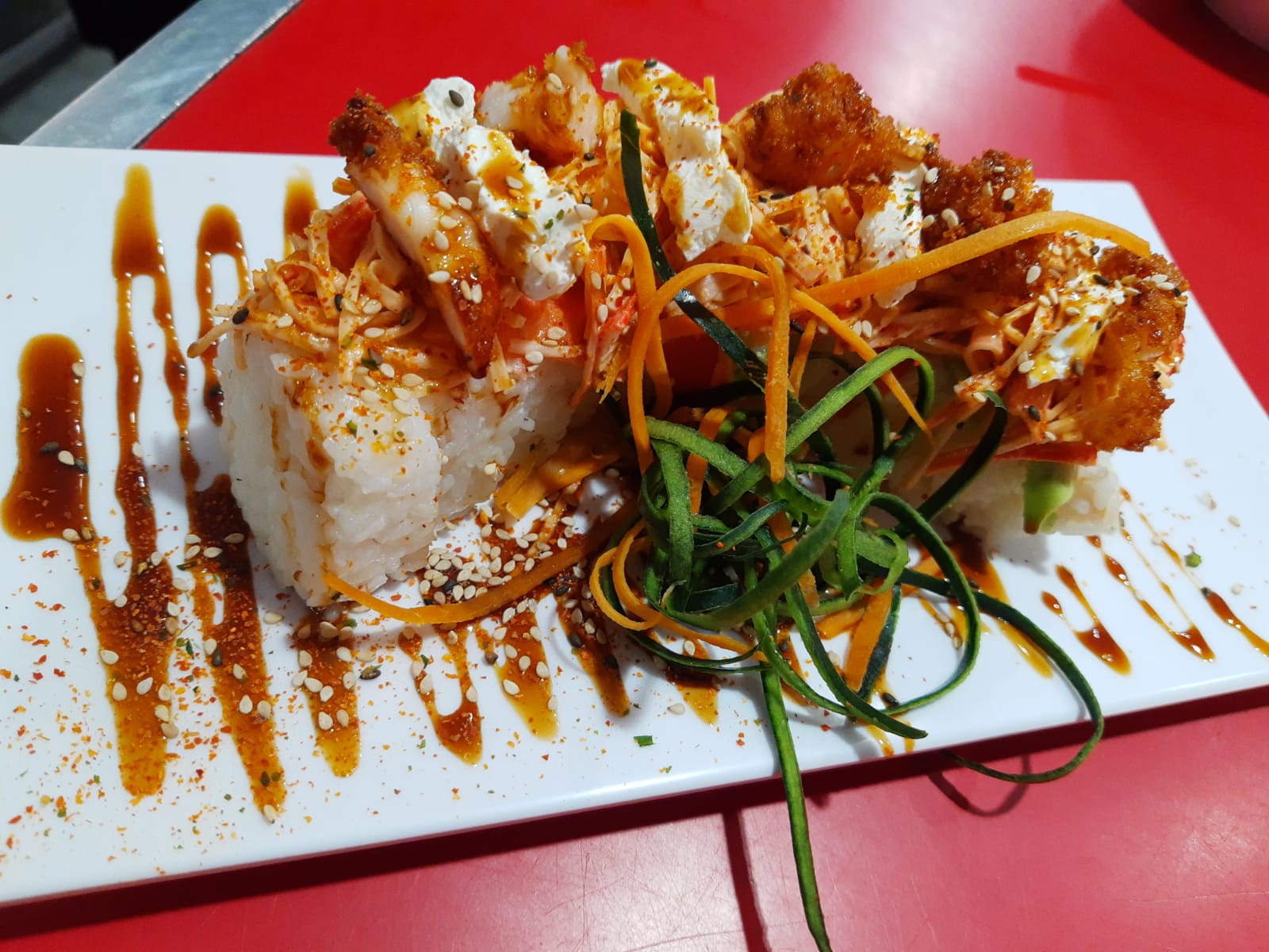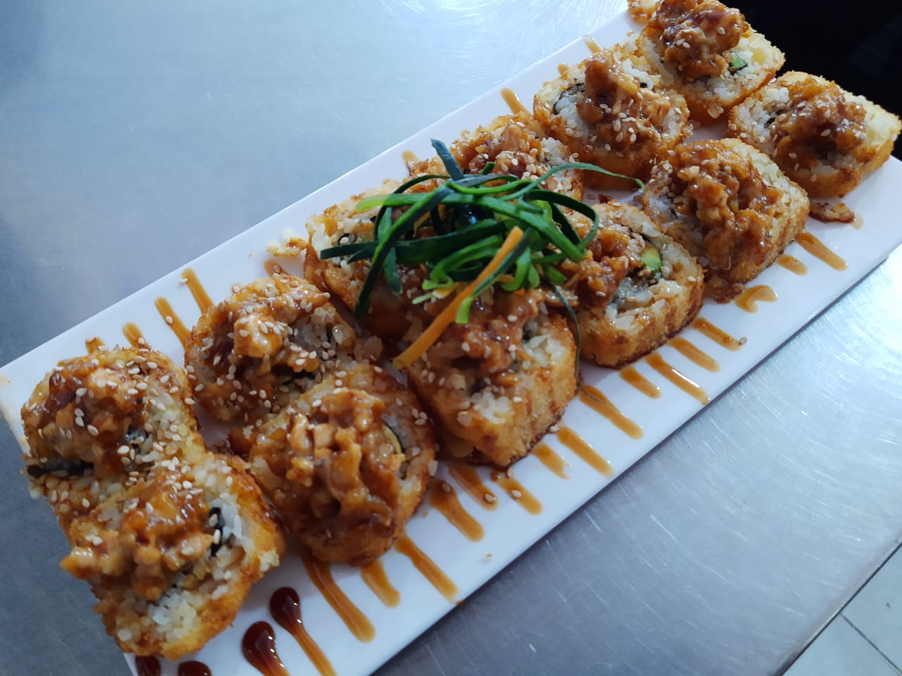 Pasta a base de quesos y trocitos de pollo, chile serrano y cebollita asada. Philadelphia, pepino y aguacate dentro, bañado en salsa de anguila y ajonjolí.