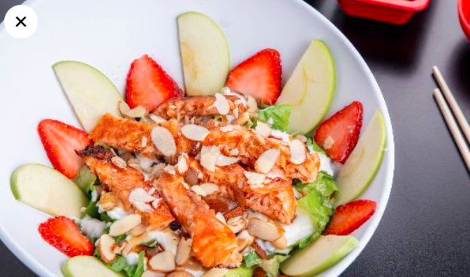 Salmón a la plancha con un toque agridulce, montado sobre ensalada mixta, fresas, manzana, frutos secos y un toque de queso de cabra, una explosión de sabores.