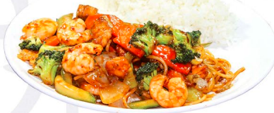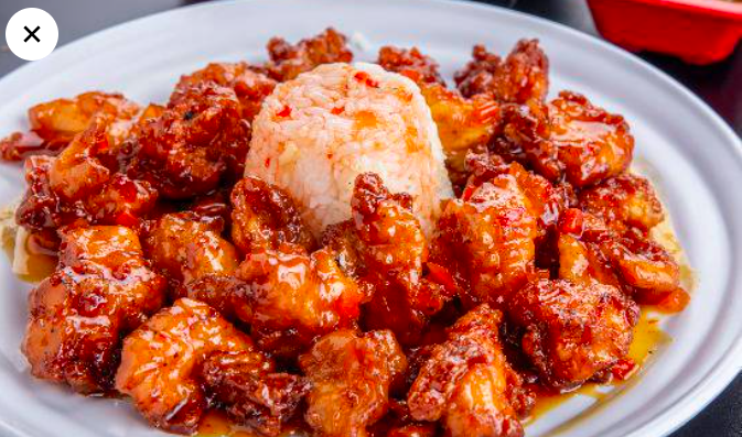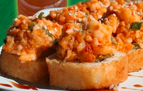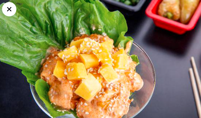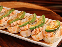 Camarones roca bañados en salsa chili, cubiertos de aguacate, ajonjolí con aderezo de jalapeño.
