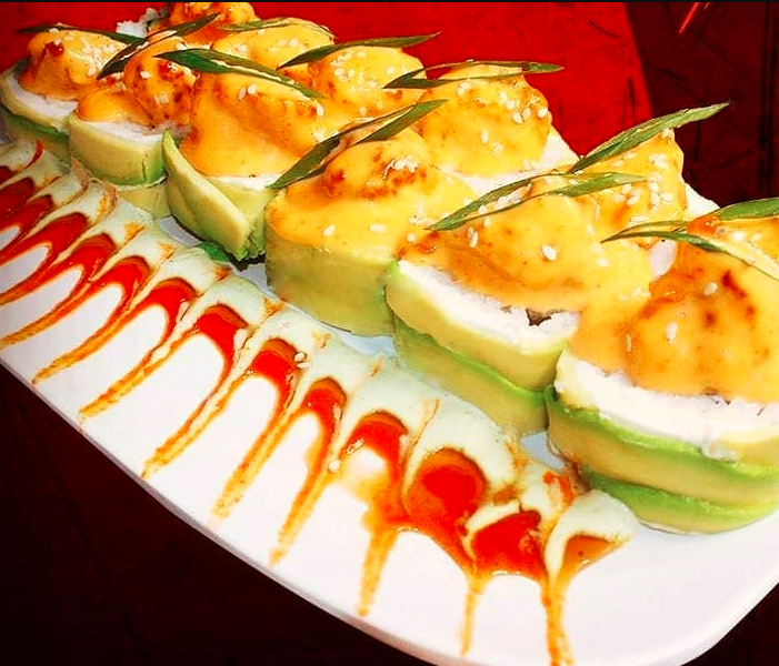 Natural de Atun, phila, aguacate, pepino y mango. Por fuera avocado, masago, aderezo de chipotle y bañado en togarashi. cebollín y salsa de anguila.