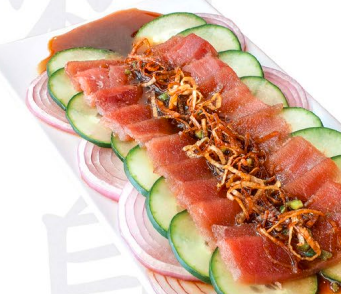 Cubos de atún fresco, aguacate,pepino y cebollita crunch, acompañada de salsa anguila.