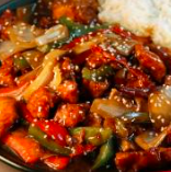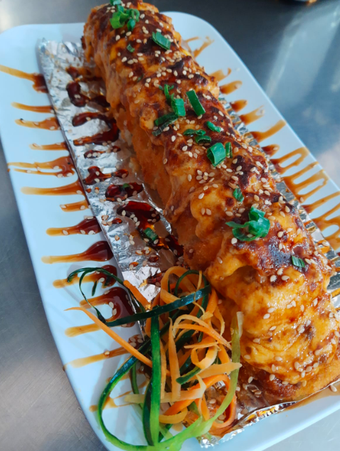 Arroz frito con Philadelphia, tampico, salmón frito, aguacate y furikake y bañado en salsa de anguila.
