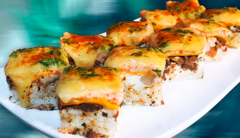 Inmensidad de sabor en cada bocado, cuadratto al horno a base de arroz con furikake, Tampico, 3 quesos con serrano, res, pollo y tocino por dentro.