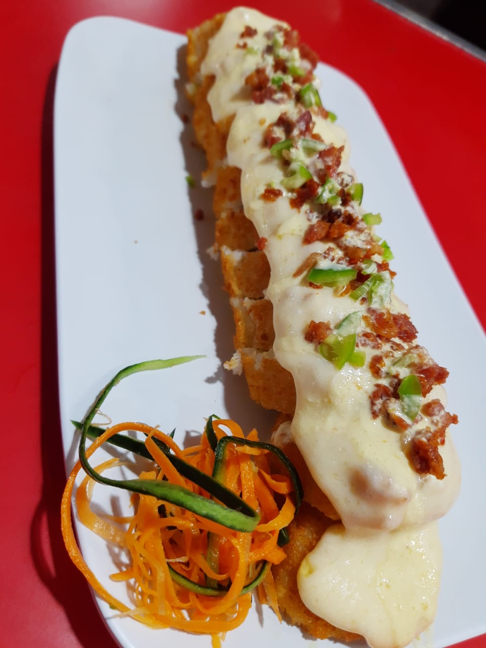 Guacamole, pico de gallo, camarón empanizado, chispas de tocino, Philadelphia y pepino, bañado en crema de jalapeño y ajonjolí mix.