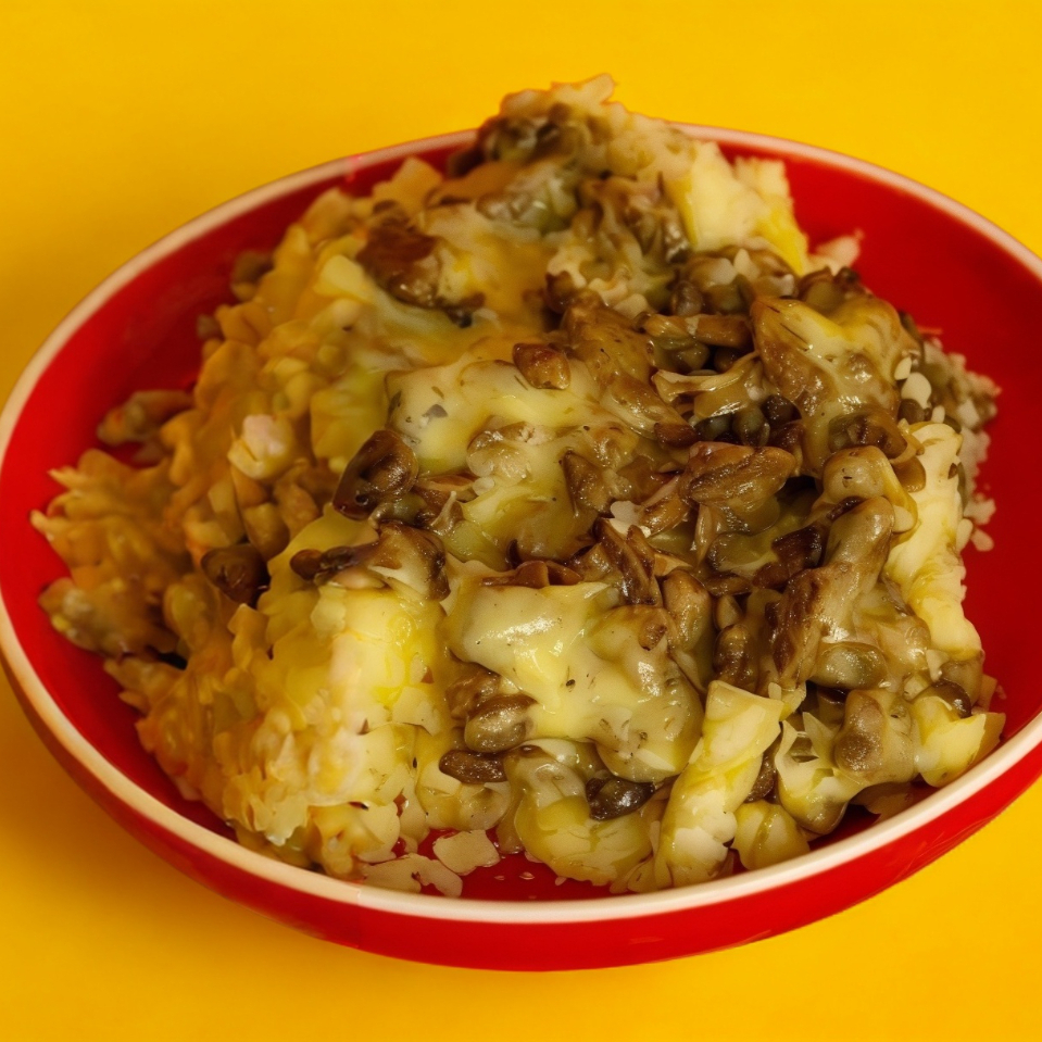 Papa sazonada con una capa de carne y queso gratinado por encima, ideal para 2 personas, incluye frijoles, tortillas, salsa, chiles y cebolla asada.
