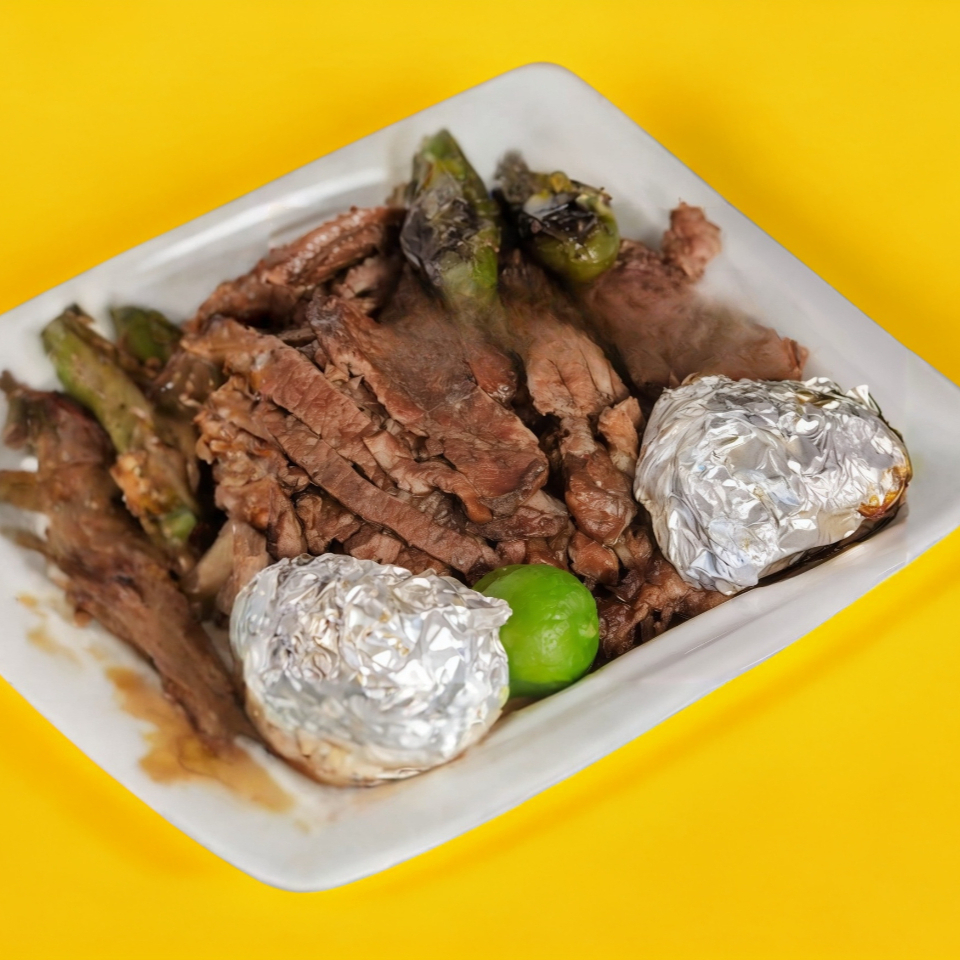 2 Papas sazonadas con una capa de carne sirloin, gratinadas con queso, incluye frijoles, tortillas, salsa, chile y cebolla asada.