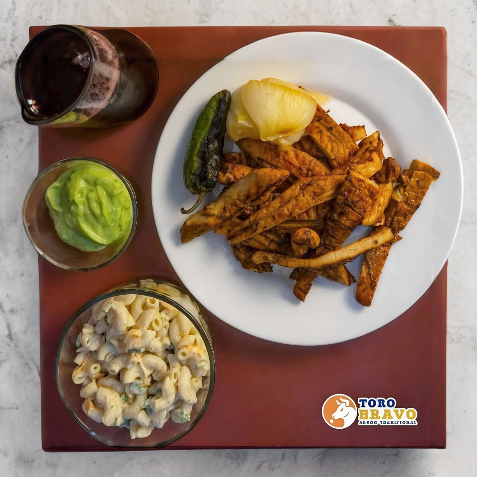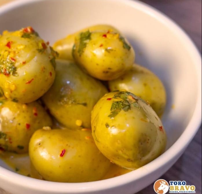 Papas cambray sazonadas con un gravy enchiladito al estilo Toro Bravo.