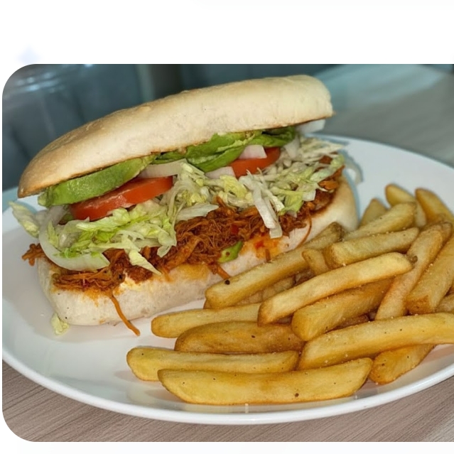 Telera mayonesa cochinita lechuga tomate cebolla chile, papás fritas naturales