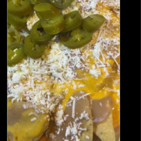 Totopos frijoles puercos queso amarillo queso cojita y chiles jalapeños