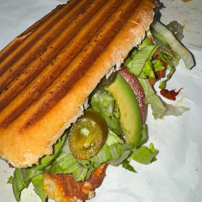 Telera mayonesa cochinita lechuga jamón queso americano lechuga tomate cebolla chiles y aguacate