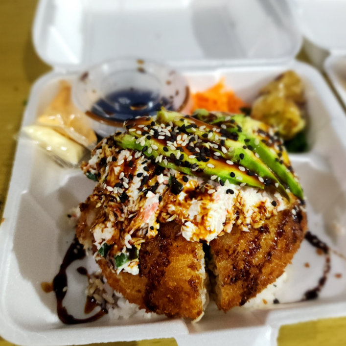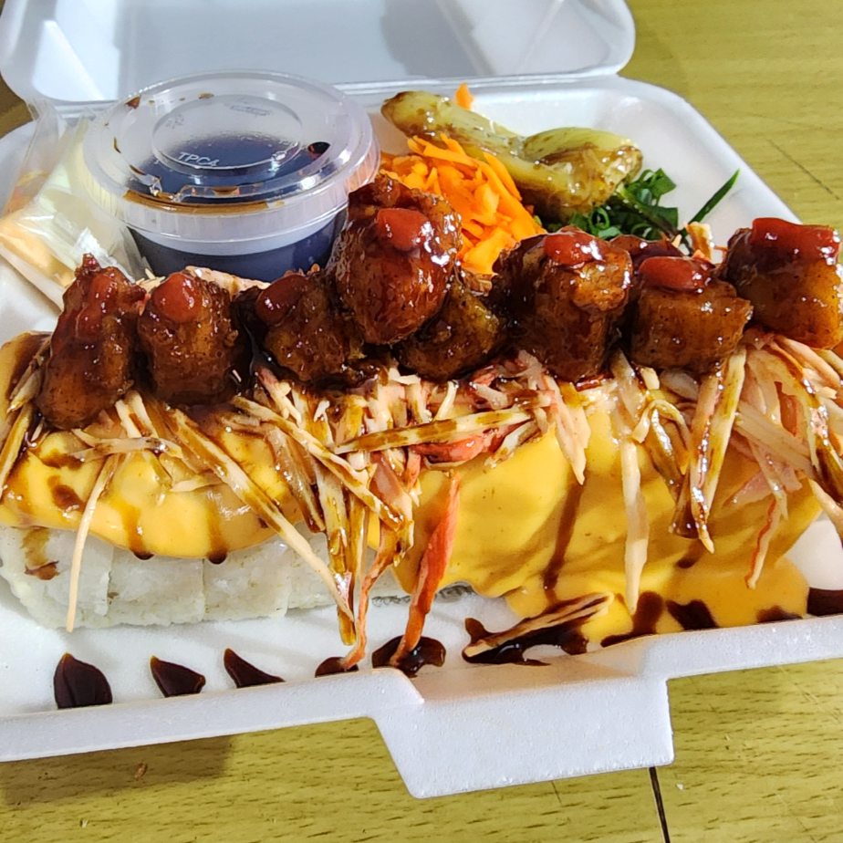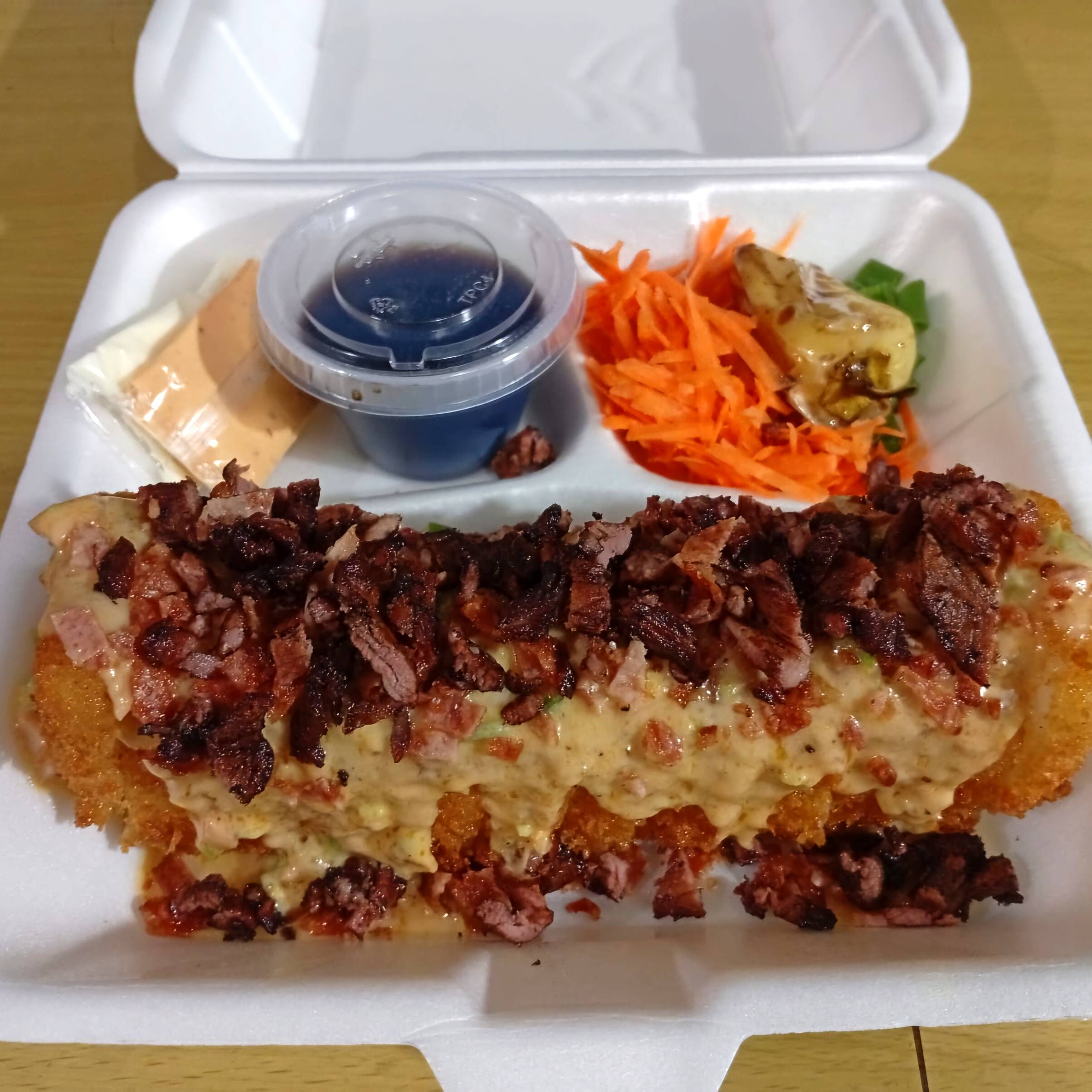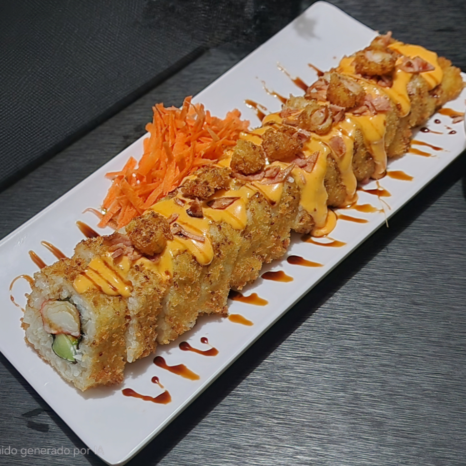 Rollo relleno de tosino,res,pollo tempura y cangrejo, por fuera queso gratinado, tampico spicy y boneles BBQ. Y por último toque de siracha y anguila