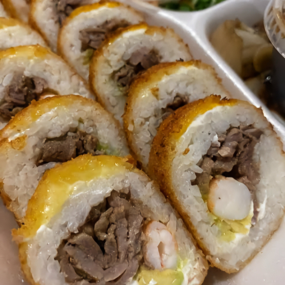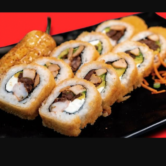Rollo de res y camarón, aguacate, philadelphia, pepino y por fuera gratinado con tocino y chile serrano