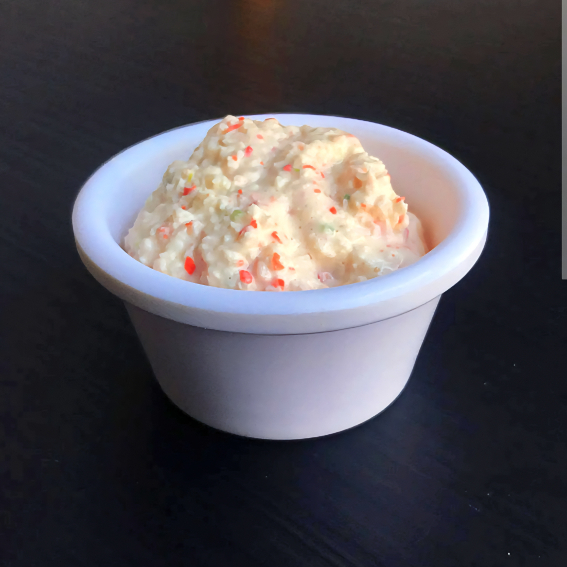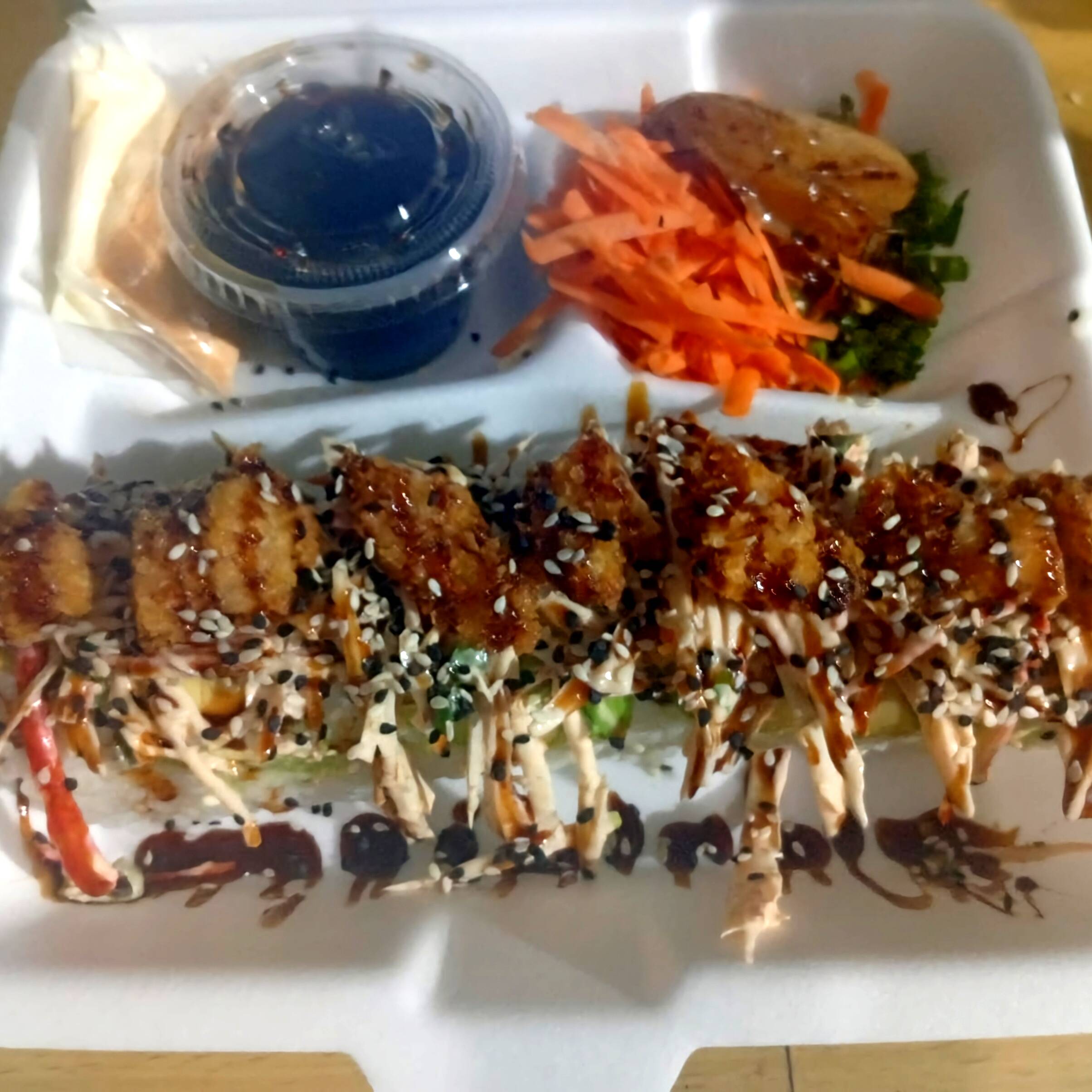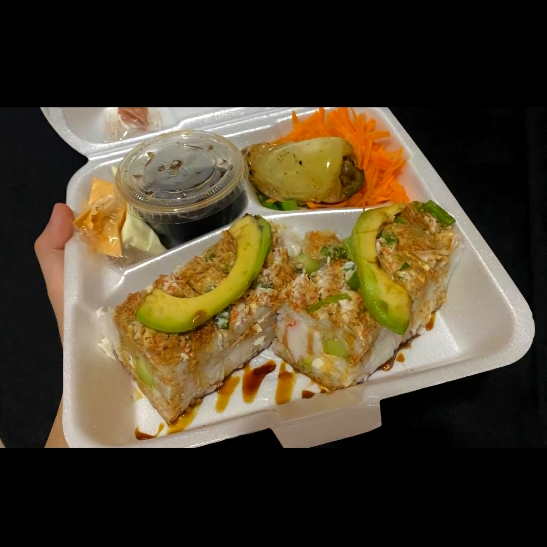 Rollo relleno de cangrejo y por fuera coronado queso chipotle y trositos de cangreji tempura y un toque de anguila y siracha