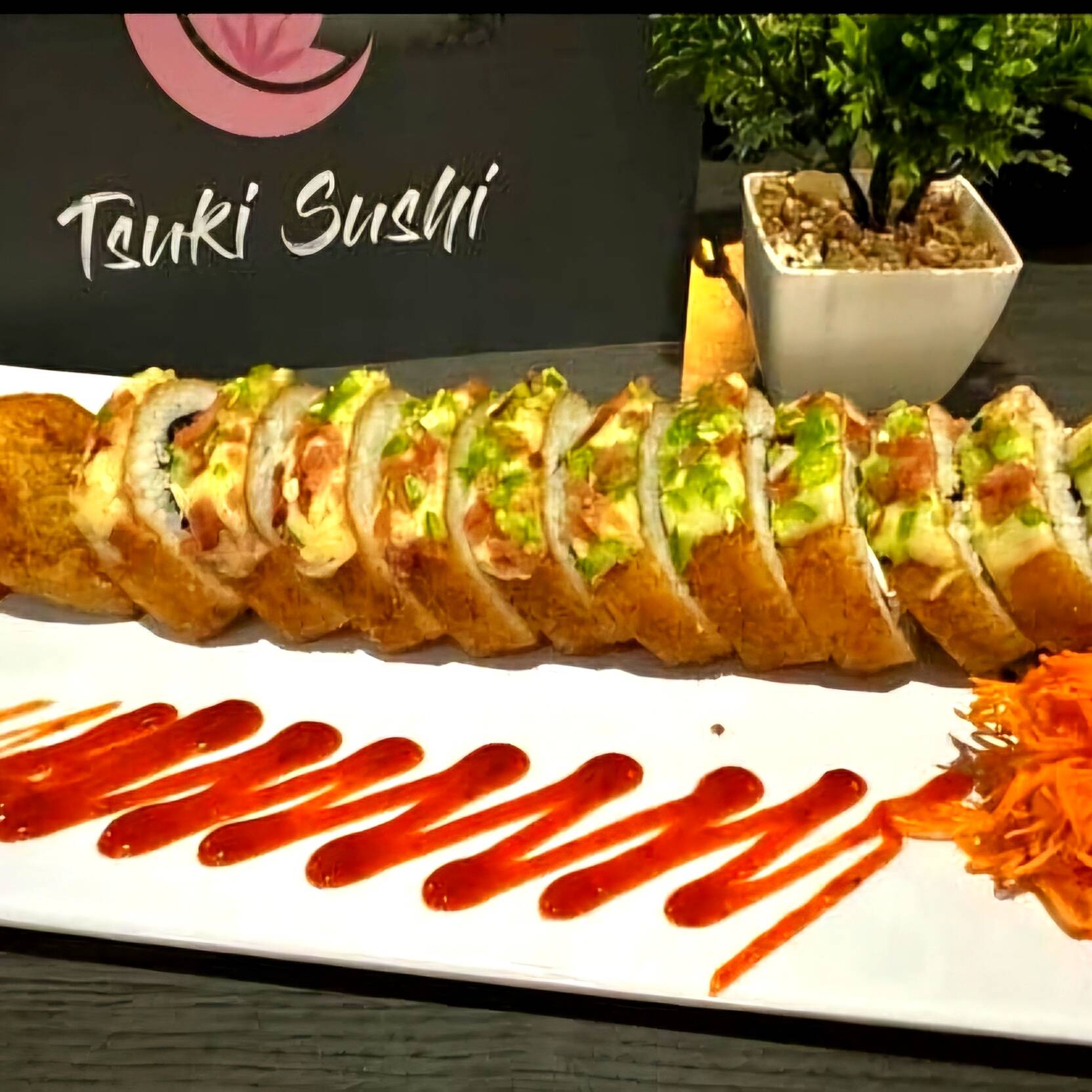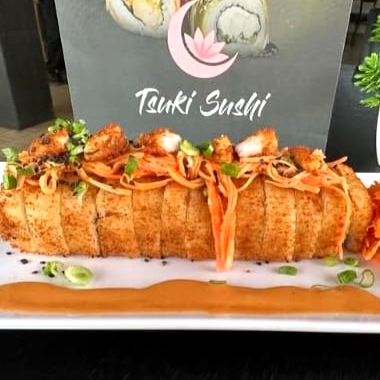 Relleno de camarón tempura, philadelphia, aguacate y pepino, coronado con tampico spicy, camarón empanizado, sriracha y salsa de anguila.