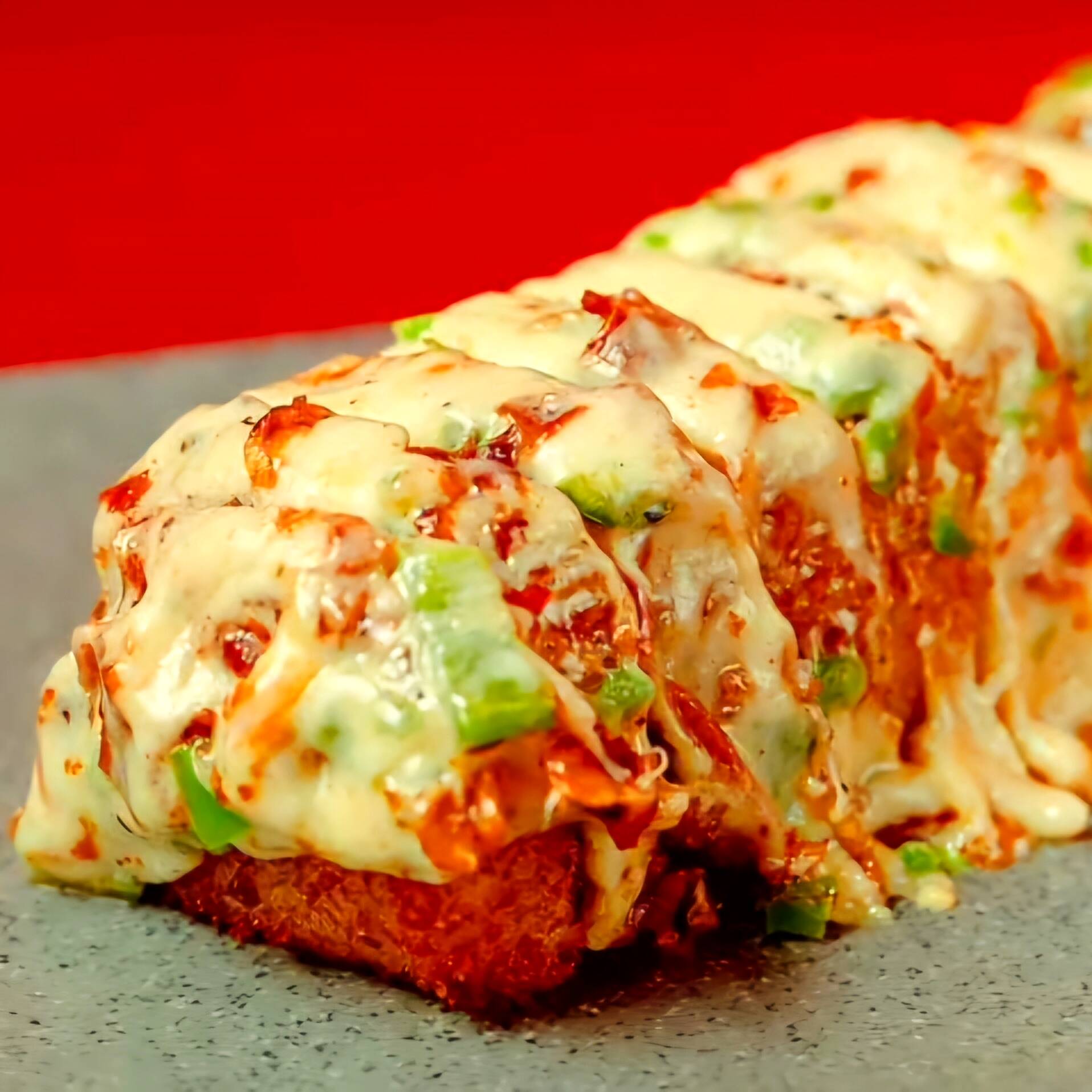 res, pepino, aguacate y Filadelfia. Por fuera, queso chipotle gratinado con rodajas de chile serrano y anguila.