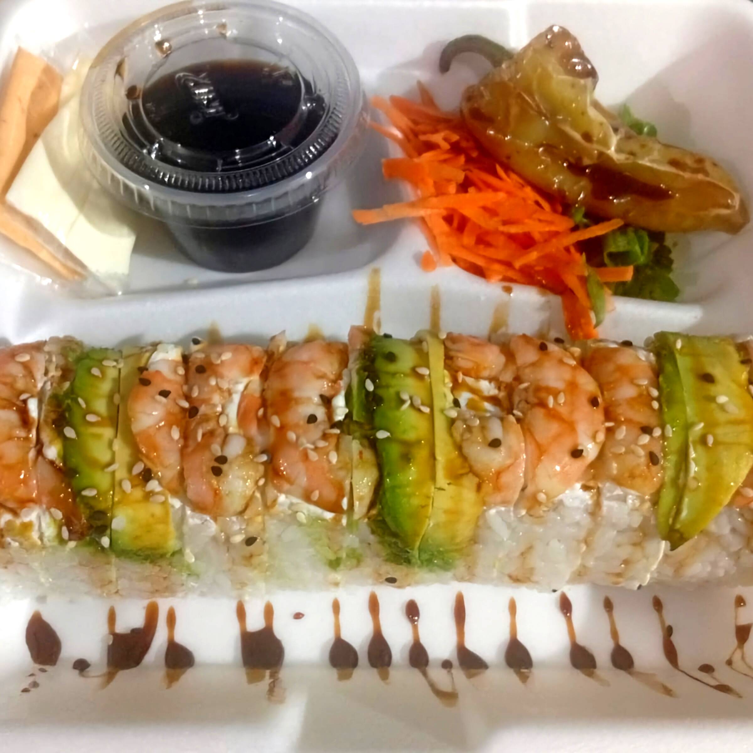 Rollo de relleno de camarón, philadelphia, pepino y aguacate, coronado con kanikama spicy, camarón empanizado, cebollín, salsa de anguila y ajonjolí