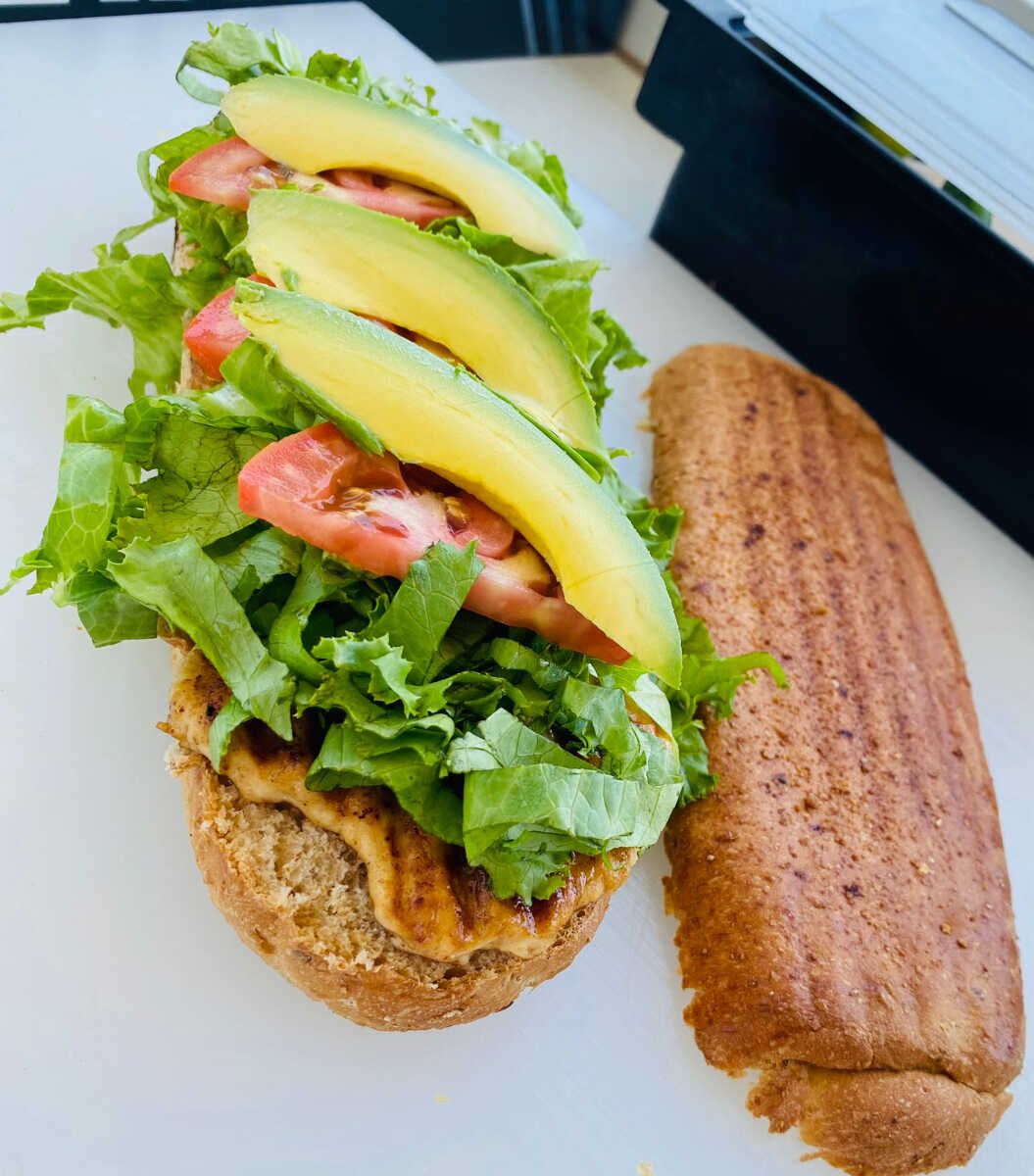 Deliciosa baguette con pollo a la plancha, queso chihuahua, mayonesa, lechuga italiana, tomate, aguacate, aderezo de cilantro y chiles jalapeños.