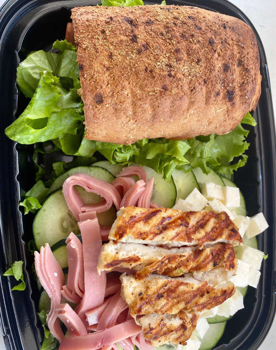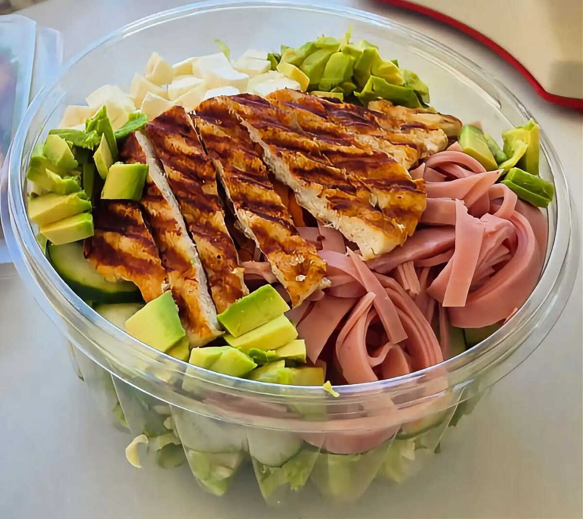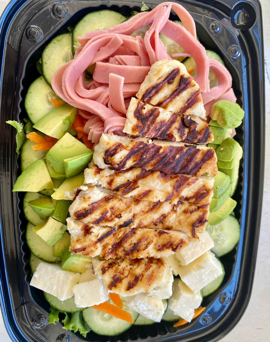 Nutritiva ensalada con lechuga italiana, zanahoria, pepino, queso panela, jamón y pollo a la plancha.