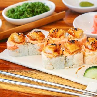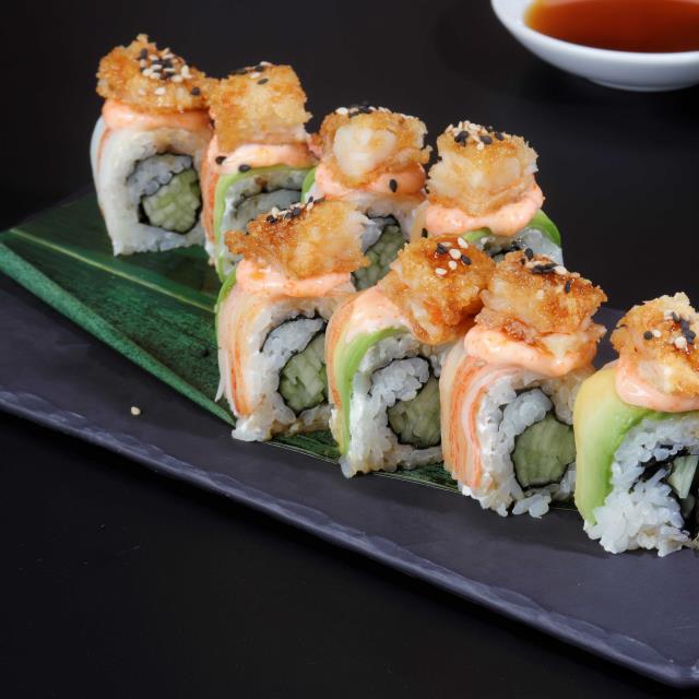 Sushi natural envuelto en pulpo y aguacate, coronado con ensalada de kanikama y trozos de camarón empanizado.
