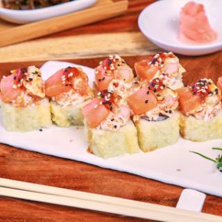 6 rollos envueltos en salmón, alga, aguacate, pepino, queso crema dentro, topping de ensalada pulpo, coronado con camarón emp. y espejo de aderezo