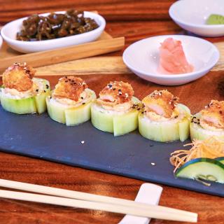 Cono de arroz envuelto en pepino con trozos de camarón empanizado y aderezo de masago.