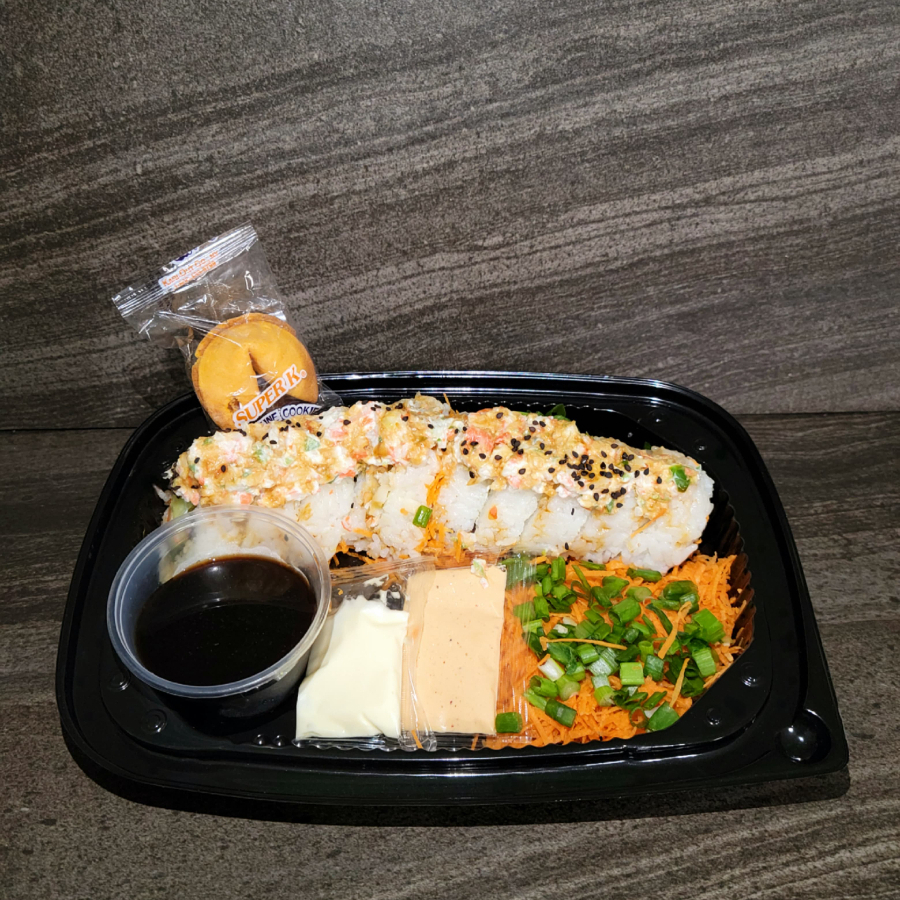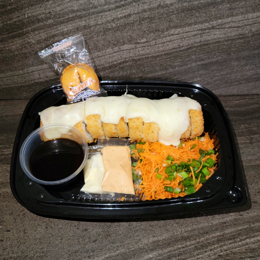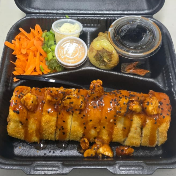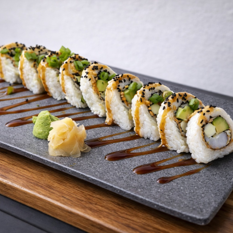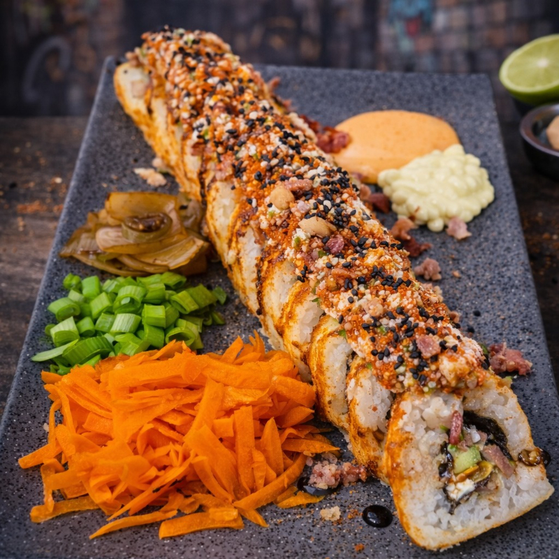 Pollo, Camaron, Tocino, Phila, Aguacate, Pepino, cubierto con aderezo Spacy
